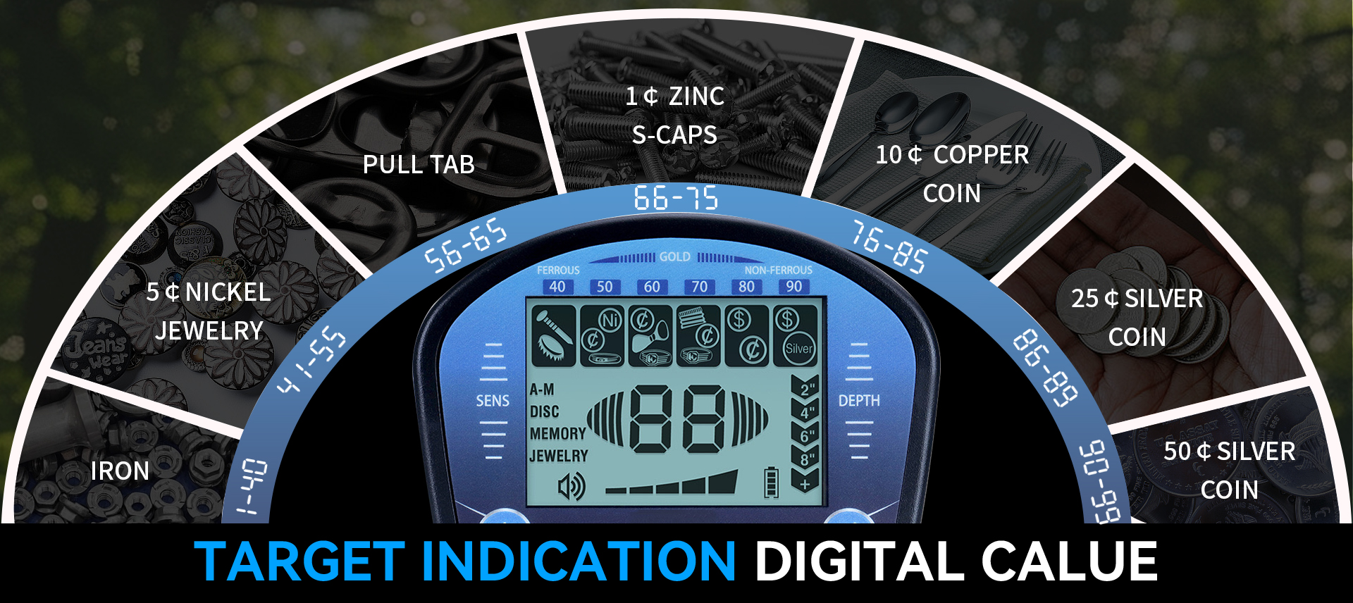 Metalldetektorer har 5 forskjellige moduser som lar deg effektivt søke etter de ønskede metallene. Alle METAL MODUS , DISC MODE , MEMORY MODUS , JEWELRY MODUS
